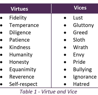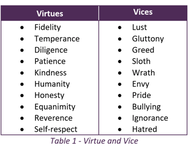 Virtuous qualities of character can be divided in subsets of virtue and vice. Virtues are positive character traits while vice are the negative traits. The sum of virtues and vice is an insight as to character. Virtues and vice are listed below.