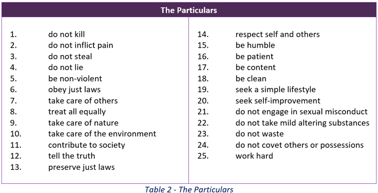 ‘The Particulars’, of which there are twenty-five identified, are a means to apply ‘The Precepts’, which are the higher guidance. They assist to find pathways to improvement. They are not complete but rather examples of the practical application of ‘The Precepts.’ The twenty-five ‘Particulars’ are listed below: