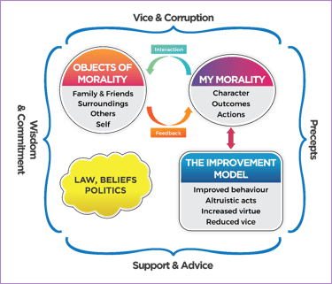 The ‘Moral Improvement Model,’ (see Part 7 – Reflection) provides a simplified description of what is needed for moral improvement and is expanded in the ‘Moral Compass’ below which depicts moral improvement from a more holistic point of view as influenced by many factors. A more in-depth version of ‘The Moral Compass’ is also provided at Annex B.