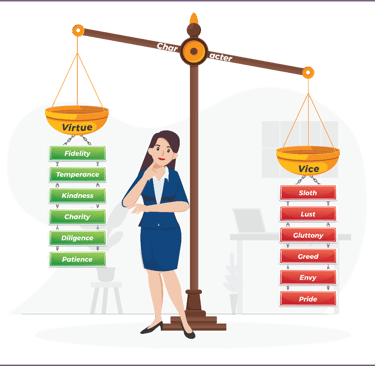 Character is the true balance of who we are, as opposed to persona which is the outwardly perceived aggregate of our vice and virtue by others.