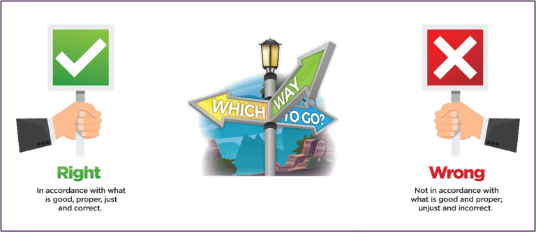 Outcomes. Outcomes are the product, result, or consequence of our actions. The outcomes form the basis for judgement of whether the action was good or bad. These two concepts are again a single construct with two extremes, where ‘wrong’ is defined as the negative or opposite of the ‘right.’ ‘Right’ is in accordance with what is good, proper, or just and correct. ‘Wrong’ is not in accordance with what is good, proper, or unjust and incorrect.