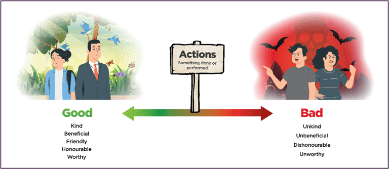 In the same manner that ‘good and evil’ are the same construct in viewing our persona, so too are ‘good and bad’ a single sliding scale of assessing the outcomes of our actions. Good actions are measured in kindness, benefit, friendliness, honor and worth. Bad actions are measured in the exact negative or opposite, i.e., unkindness, un-beneficial, dishonorable, and unworthy. The principal aid to assessment of moral actions is measurement of the outcomes.