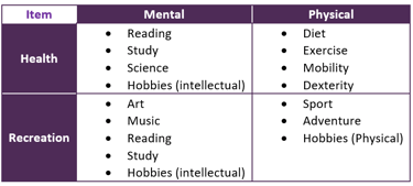 Health and recreation is core to wellbeing. It is a central theme of happiness. Health and recreation can be considered from the perspectives of physical and mental wellbeing, both of which are linked and co-dependent. Effort must be undertaken to take care of both components to achieve balance. A four-quadrant approach to health and recreation is provided in the table below. The elements shown are some of the more common considerations. The lists is indicative and not to be considered all inclusive.