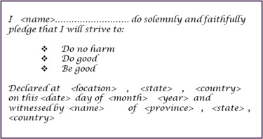 A formal and public pledge is a means to achieving a personal commitment to an appropriate set of behavioural standards. While this is not necessary, it does provide commitment that forms part of our honour and integrity among those around us. The public nature of such a commitment allows us to draw on the support and expectations of others. Below is an example of a pledge based on the three ‘Precepts’ that can be used to commit to a set of behavioural standards.